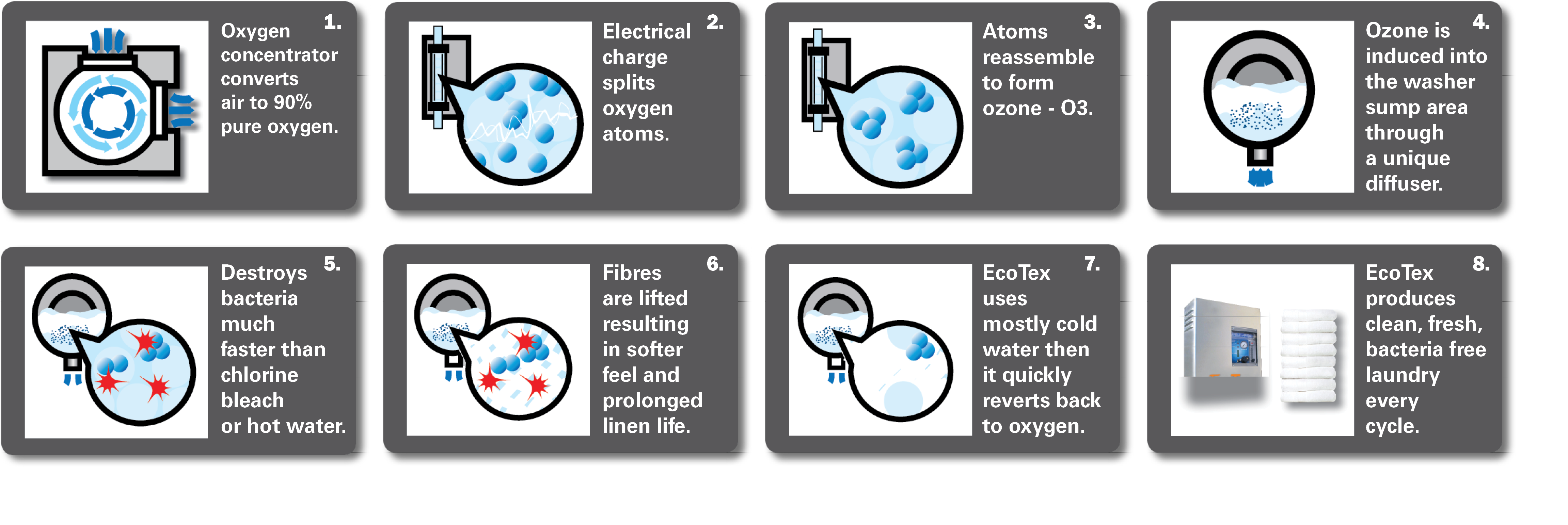 Eco3Tex? 臭氧洗衣系統將空氣轉化為 90% 的純氧,然后充電以分裂氧原子。通過在整個洗滌周期中持續注入臭氧,可以消除有害細菌、病毒和超級細菌,包括 MRSA、艱難梭菌和其他病毒。一旦洗滌循環完成,這些原子就會重新組裝形成氧氣。